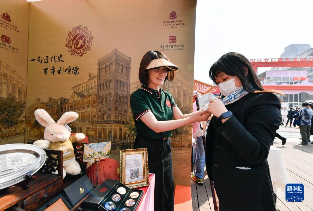 3月31日,在天津海河古文化街親水平臺,游客購買津城老字號品牌的商品。