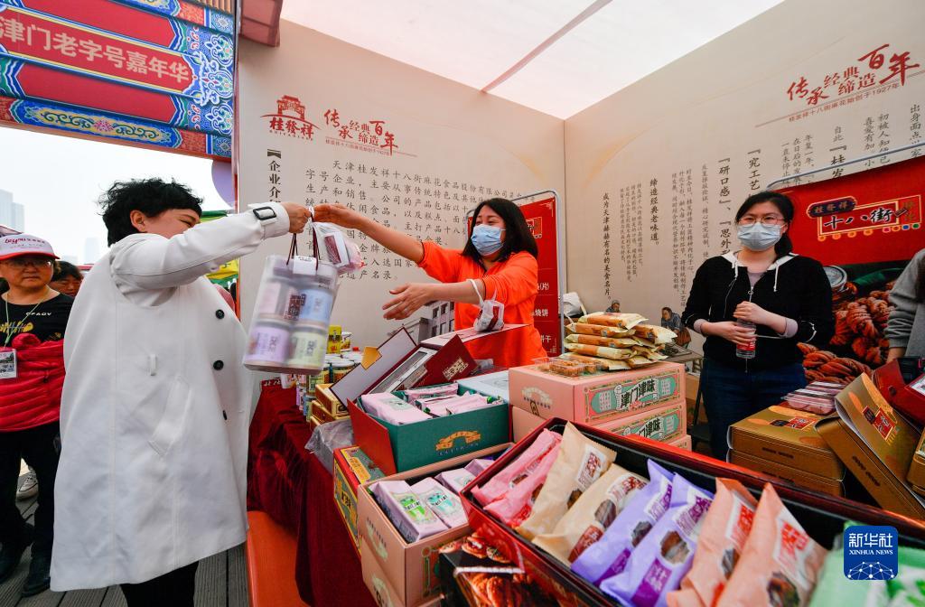 3月31日,在天津海河古文化街親水平臺,游客購買津城老字號品牌桂發祥的商品。