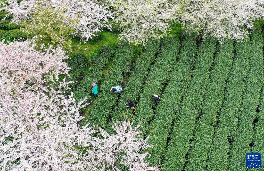 3月31日,茶農(nóng)在貴州省遵義市余慶縣松煙鎮(zhèn)二龍村茶場(chǎng)采摘茶葉(無(wú)人機(jī)照片)。