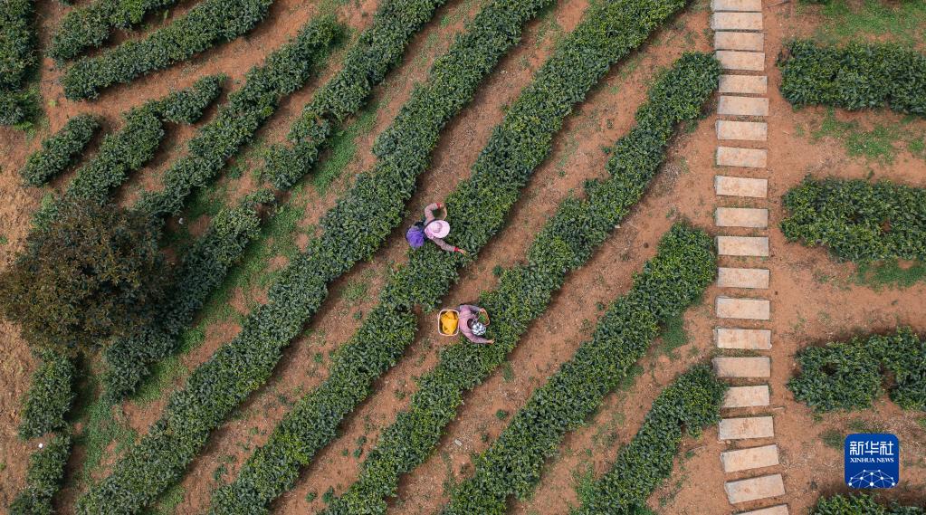 茶農在六盤水市六枝特區落別布依族彝族鄉鴻森茶園采摘春茶(3月31日攝,無人機照片)。