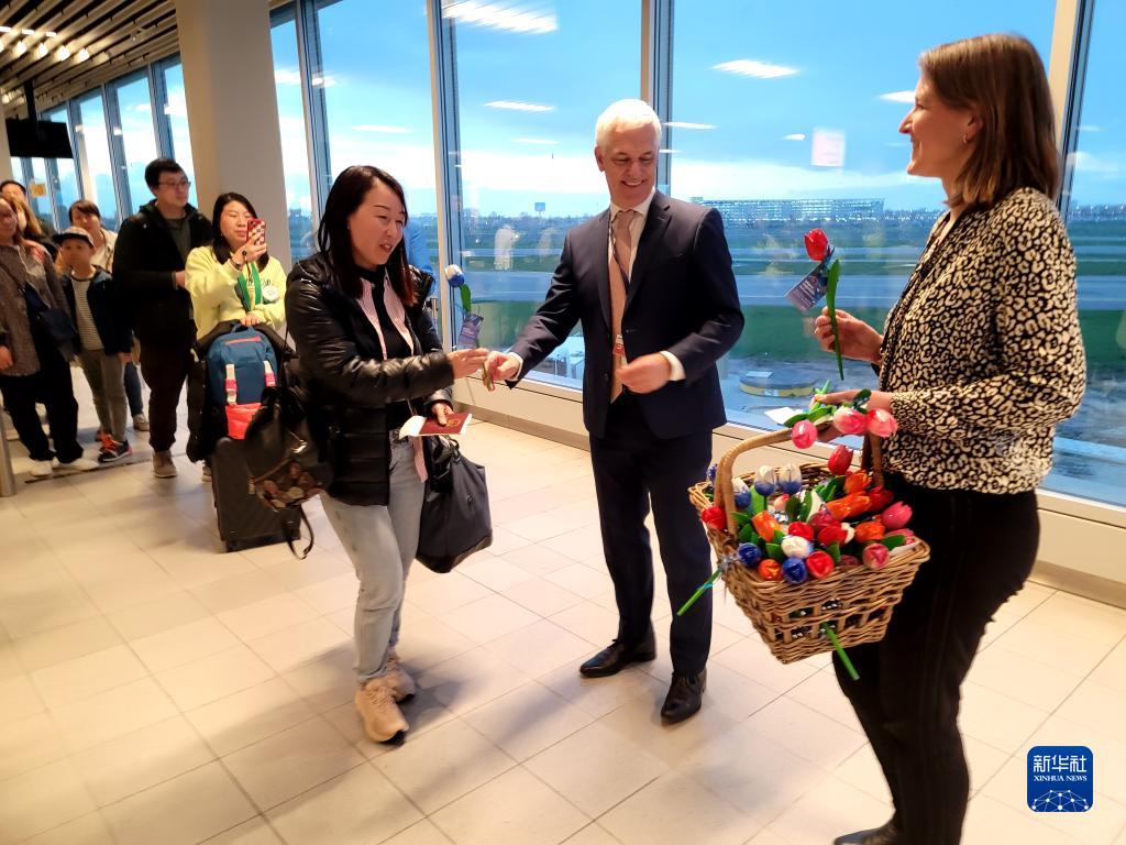 3月26日,在荷蘭阿姆斯特丹史基浦機(jī)場(chǎng),機(jī)場(chǎng)代表向乘坐阿姆斯特丹直飛北京大興國(guó)際機(jī)場(chǎng)南航航班的旅客和機(jī)組人員發(fā)放荷蘭特色紀(jì)念品——彩繪木質(zhì)郁金香。