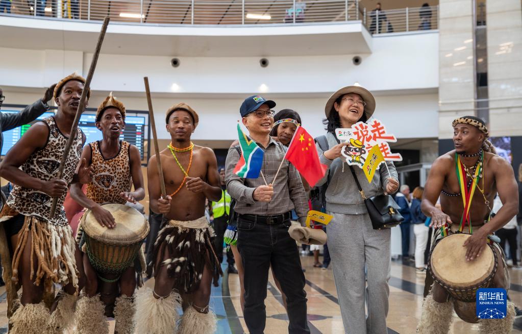 3月29日,在南非約翰內斯堡坦博國際機場舉行的歡迎儀式上,舞蹈演員與中國游客互動。