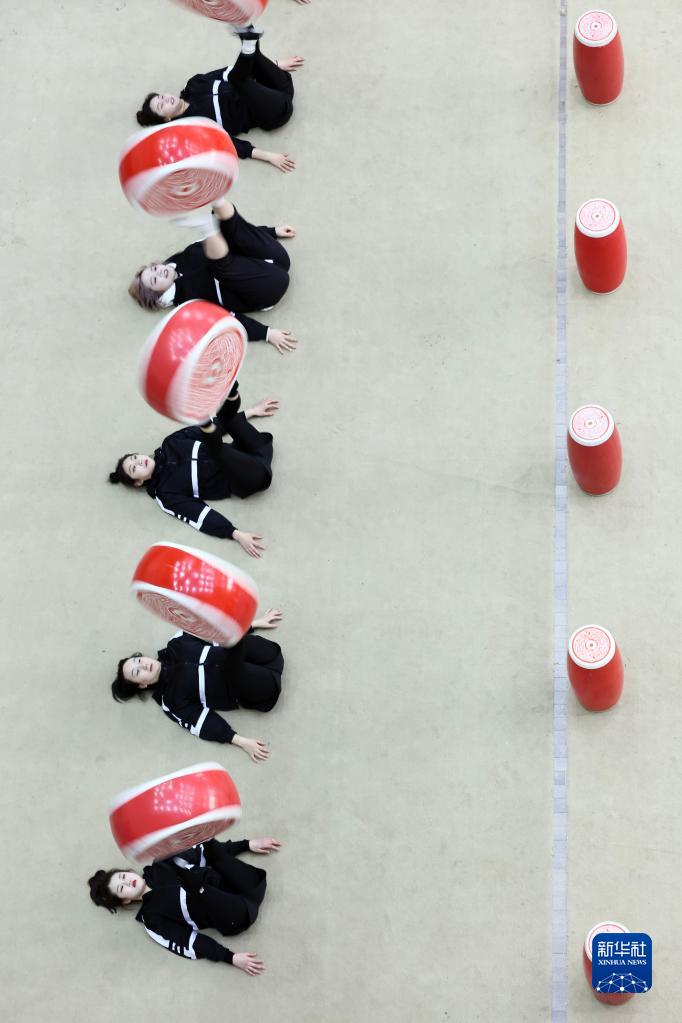 3月31日,演員們?cè)谖挥诮K省鹽城市建湖縣的江蘇省雜技團(tuán)訓(xùn)練。