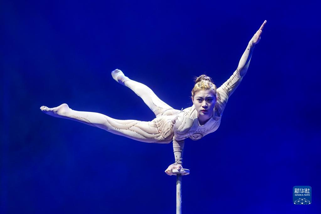 3月31日,在江蘇省鹽城市建湖縣,雜技演員王夢塵在表演雜技節目《煉——倒立技巧》。