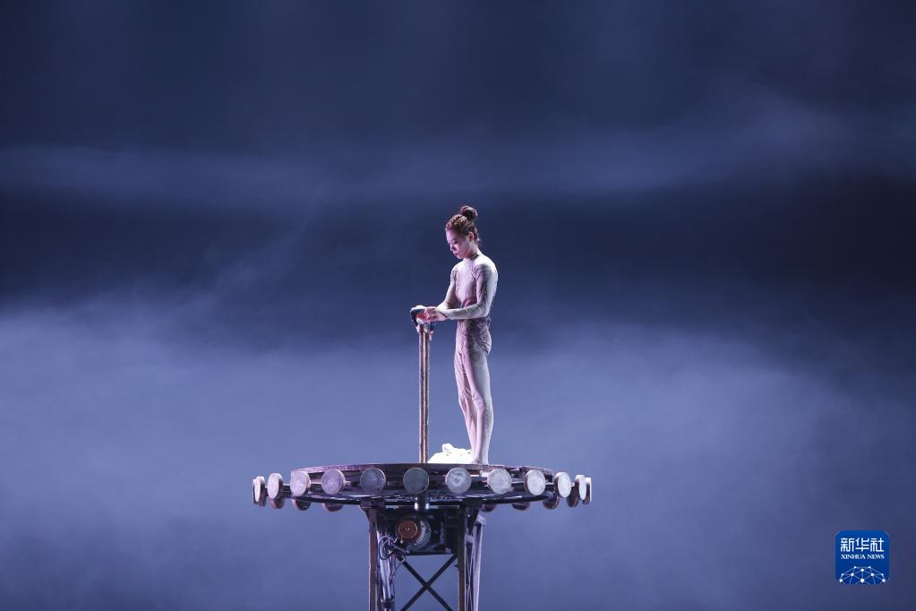 3月31日,在江蘇省鹽城市建湖縣,雜技演員王夢塵練習《煉——倒立技巧》。