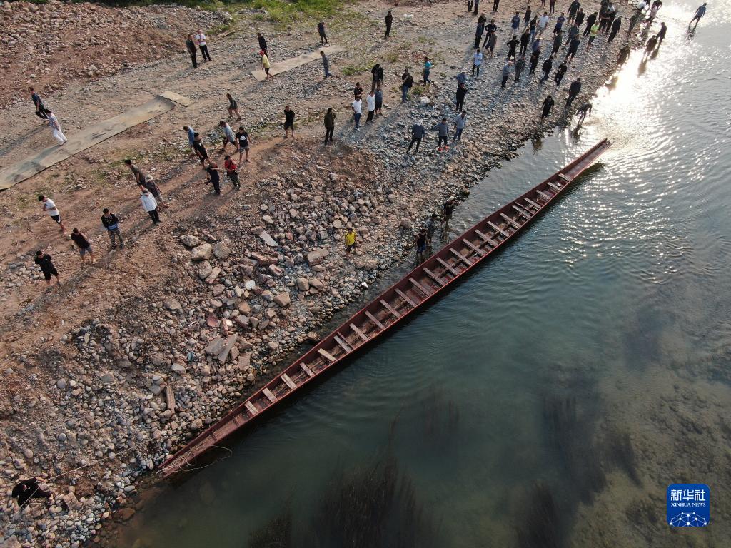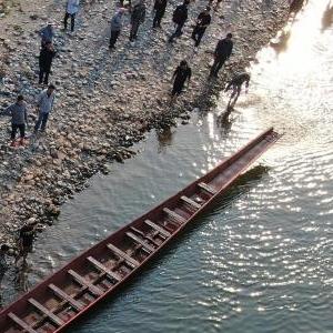4月1日,景洪市勐罕鎮曼聽村村民推送龍舟進入瀾滄江(無人機照片)。
