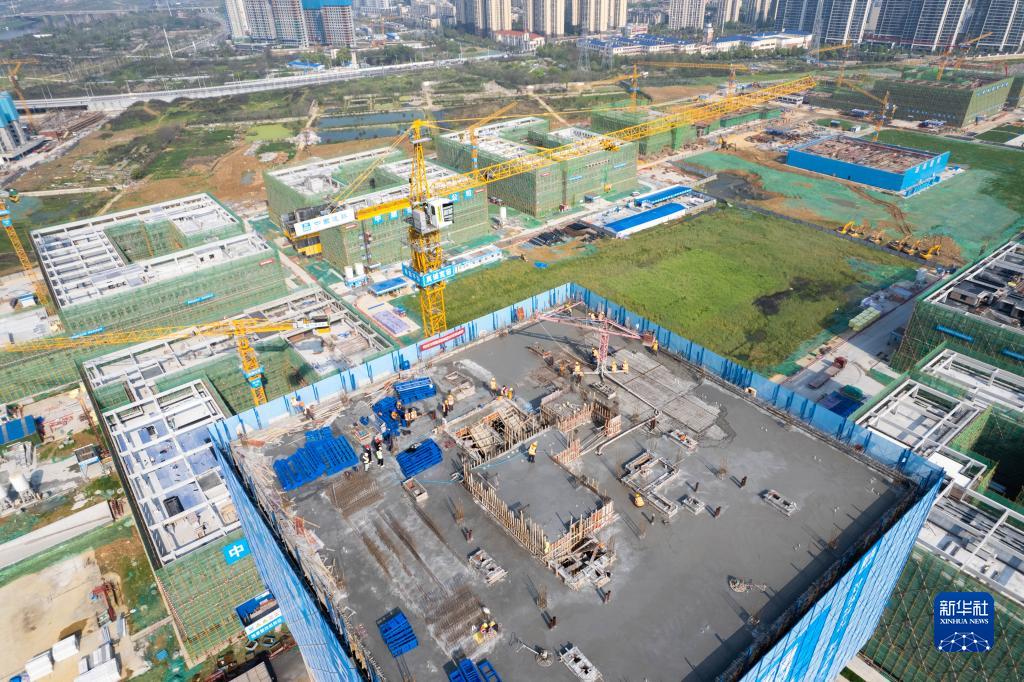 4月1日,在長沙岳麓山實驗室集聚區農大片區項目建設現場,工人在進行封頂施工作業(無人機照片)。