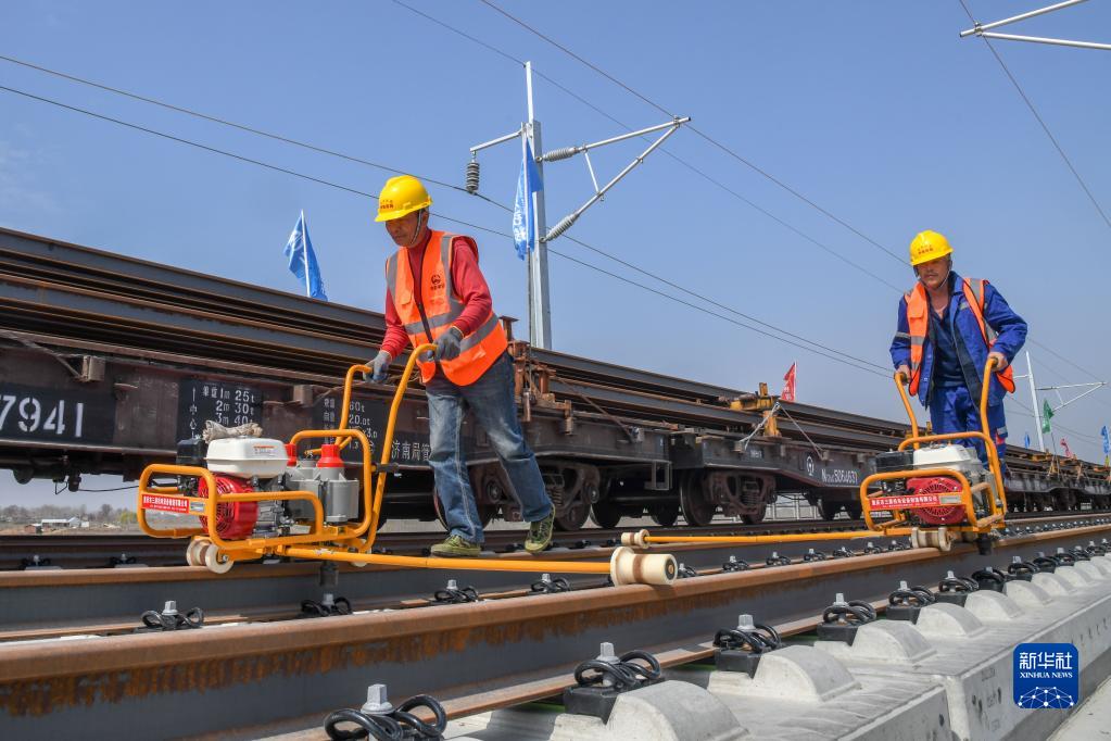 4月1日,中鐵四局集團工作人員在萊榮鐵路鋪軌施工現場鋪設軌道。