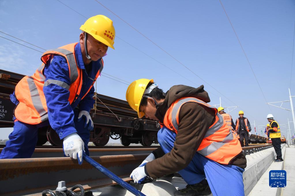 4月1日,中鐵四局集團工作人員在萊榮鐵路鋪軌施工現場鋪設軌道。