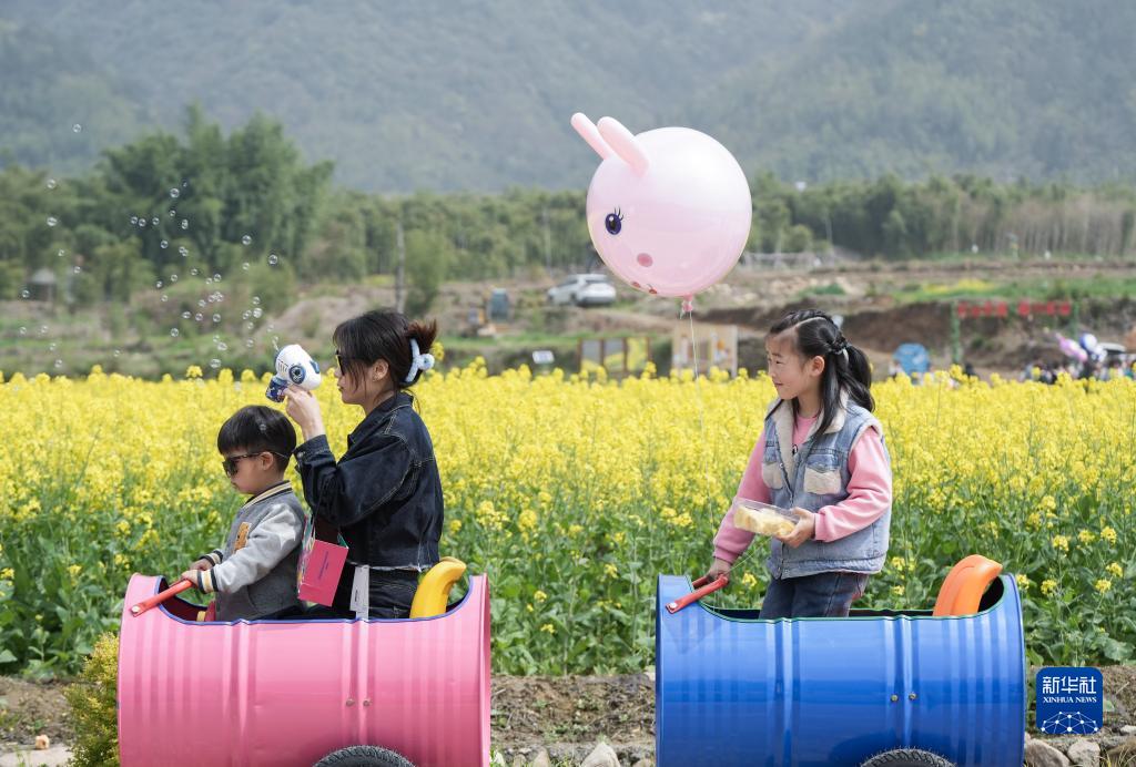 當(dāng)日,2023中國臨安郎家共富稻田油菜花節(jié)在浙江省杭州市臨安區(qū)青山湖街道郎家村“共富稻田”開幕,吸引各地游客前來感受春季田野的韻味。
