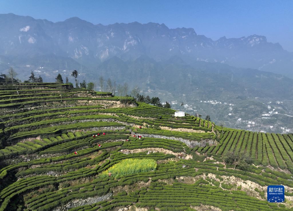 4月1日,茶農(nóng)在秭歸縣茅坪鎮(zhèn)一茶園采摘“明前茶”(無人機(jī)照片)。
