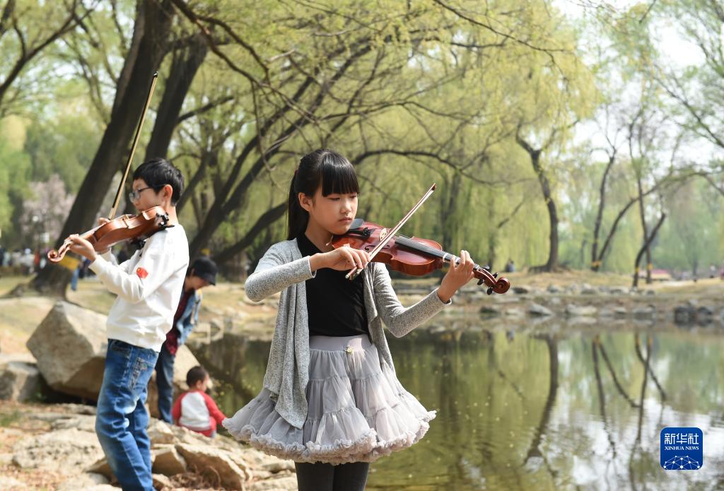 4月1日,幾名準備在圓明園春季主題詩會上表演的小朋友在練琴。