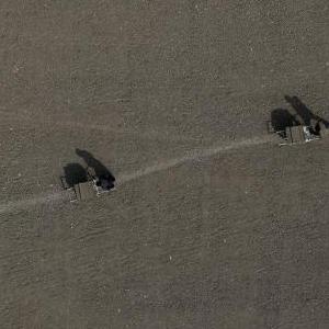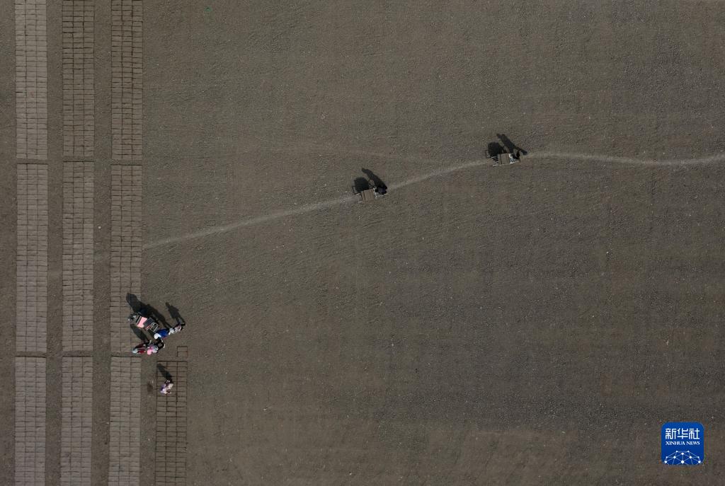 4月1日,唐山市蘆臺經濟開發區四社區的農民在育秧田間擺放育秧盤(無人機照片)。