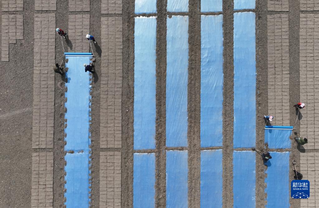4月1日,唐山市蘆臺經濟開發區四社區的農民在育秧田間給擺放好的育秧盤覆膜(無人機照片)。