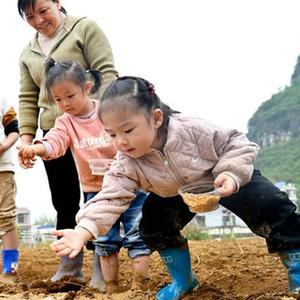 4月1日,在柳江區進德鎮龍新村龍朝屯,小朋友在家長陪同下學習播撒稻種。