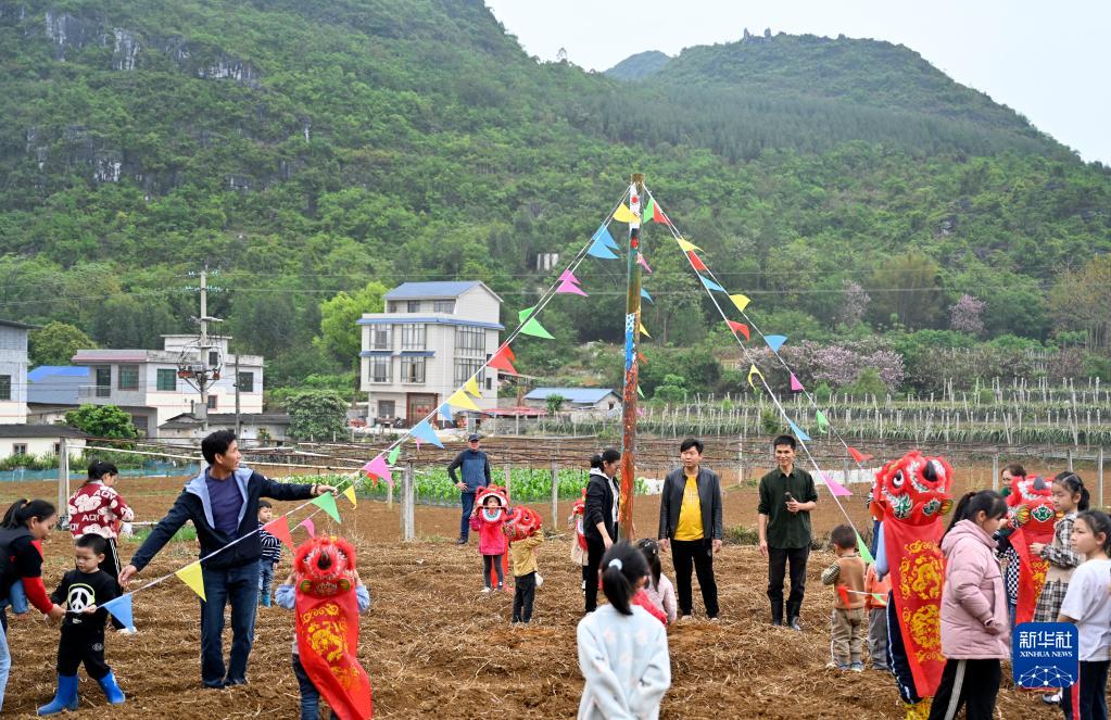 4月1日,在柳江區(qū)進(jìn)德鎮(zhèn)龍新村龍朝屯,小朋友在家長陪同下立起豐收柱。