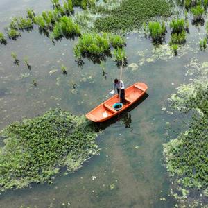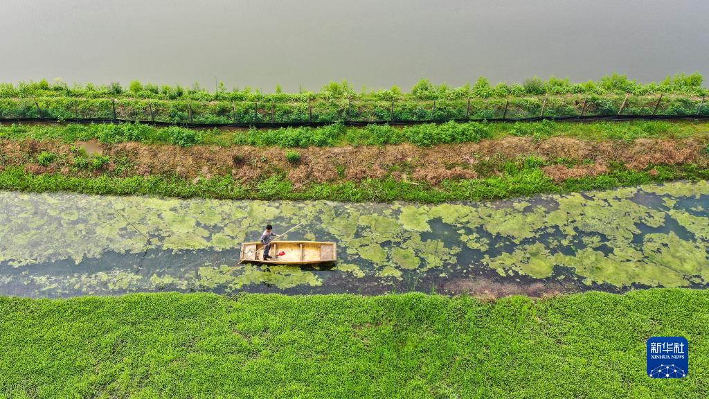 4月1日,村民在常寧市板橋鎮南洋村“稻蝦共養”生態農業基地里巡查(無人機照片)。