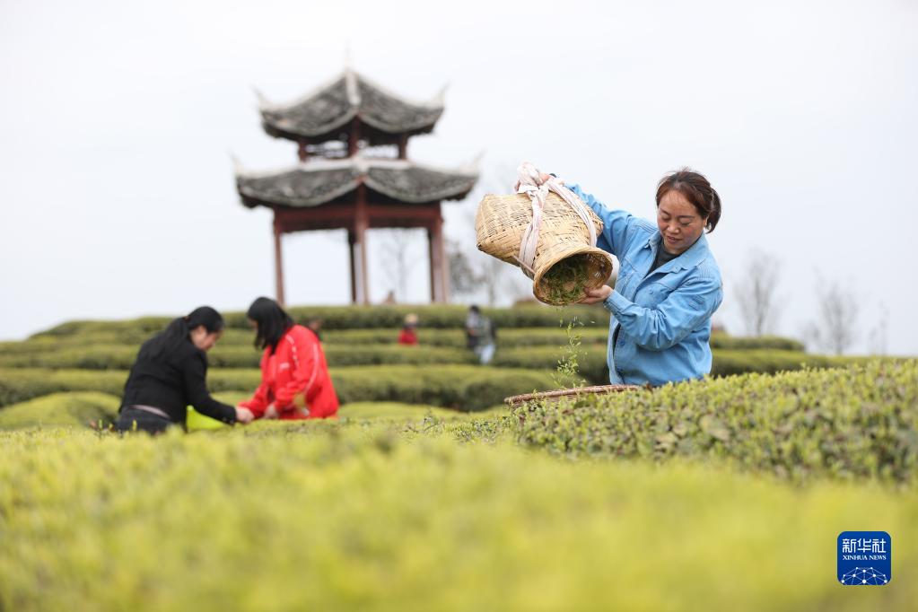 4月1日,村民在岑鞏縣天馬鎮(zhèn)一茶葉種植基地采摘明前茶。