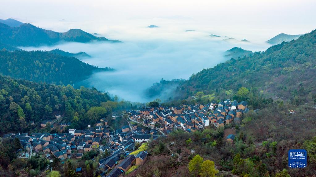 云霧繚繞的山村春景(4月1日攝,無(wú)人機(jī)照片)。