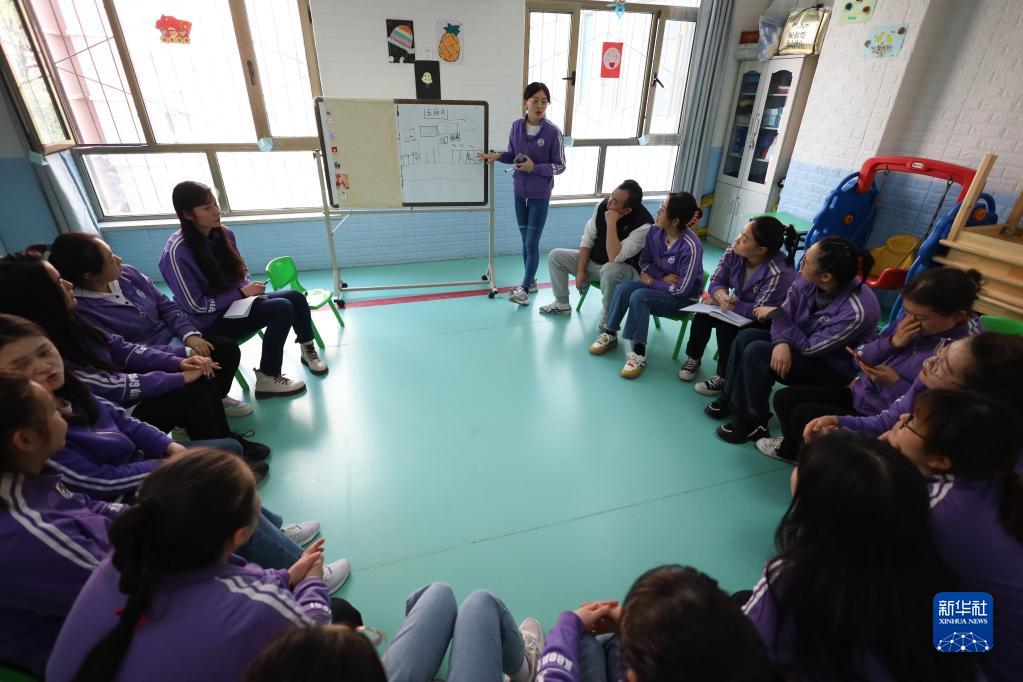 3月31日,特教老師陳進(jìn)(中)與同事交流學(xué)習(xí)。