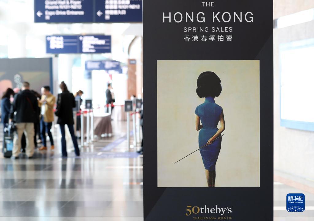這是4月1日在香港會(huì)議展覽中心拍攝的蘇富比2023年春拍宣傳牌。