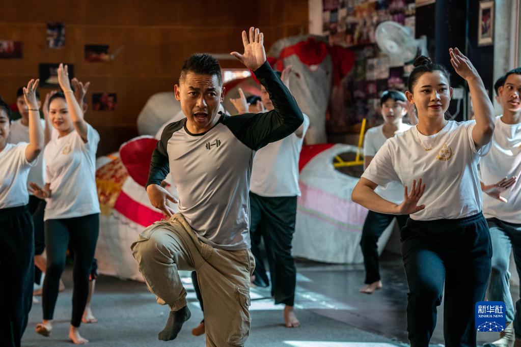 耿馬縣民族歌舞團(tuán)團(tuán)長(zhǎng)王峰(前左)在練功房和演員們一起練習(xí)耿馬傣族古樂(lè)舞(3月23日攝)。