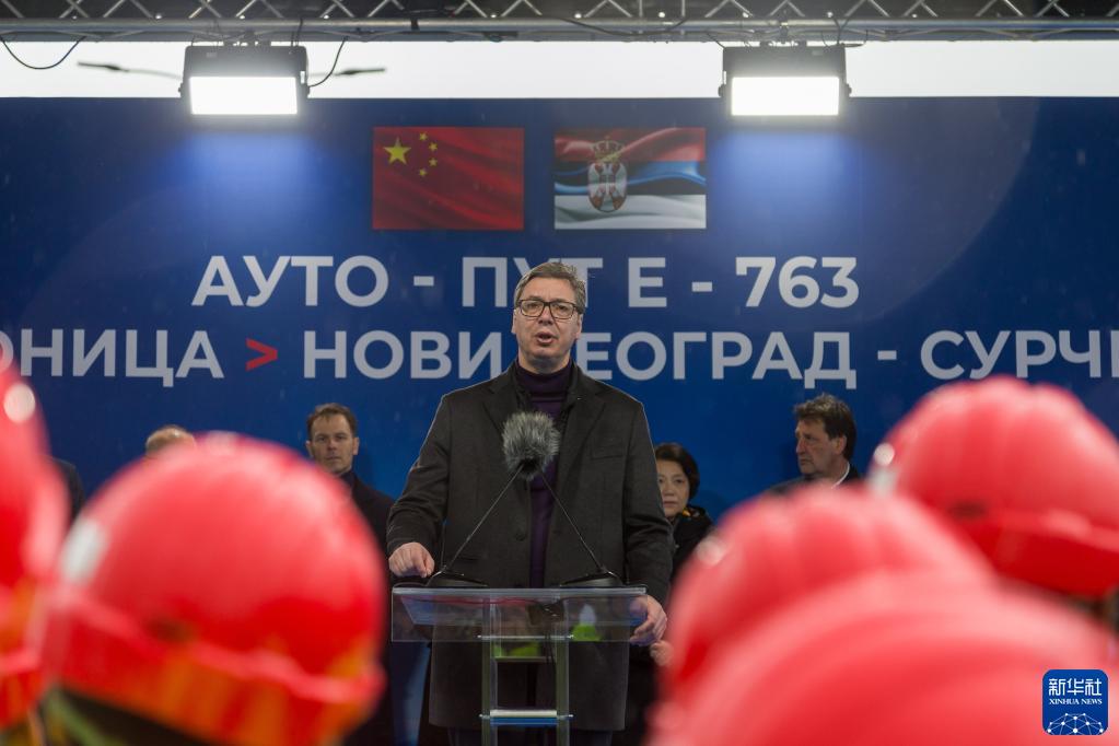 4月1日,塞爾維亞總統武契奇在塞首都貝爾格萊德的塞爾維亞E763高速公路新貝爾格萊德-蘇爾欽段通車儀式上致辭。