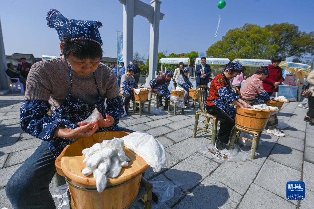 4月2日拍攝的蠶花節上的傳統繅絲技藝展示。