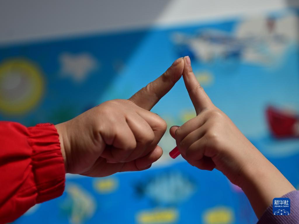 3月30日,在青海省西寧市星光特殊兒童服務中心,陳志芳(左)與一名孤獨癥兒童手指接觸做認知訓練。