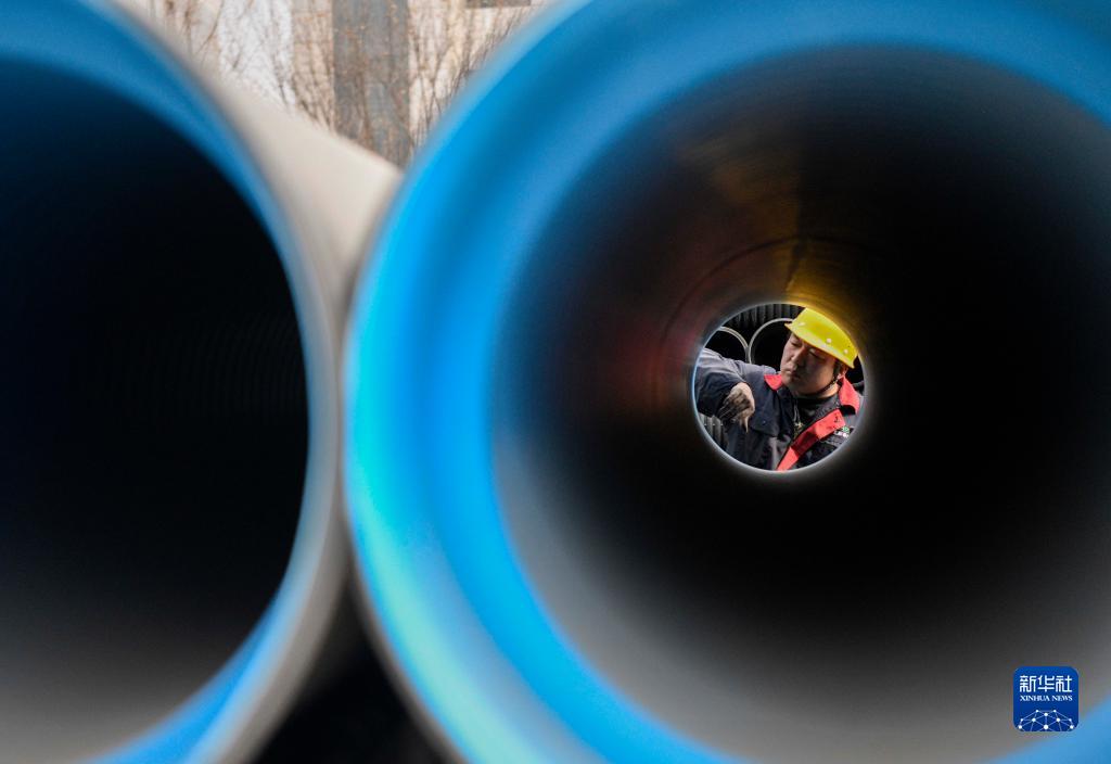4月2日,在承德縣高新技術產業開發區一家環保管材生產企業,工人在檢查管材質量。