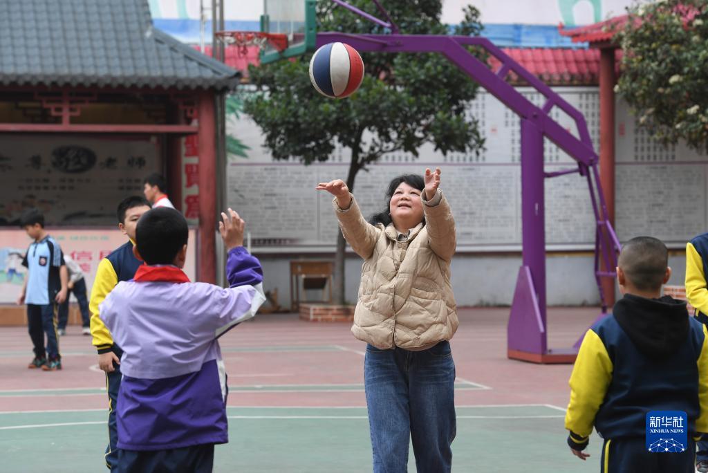在廣西南寧高新區龍華學校,何冬艷教學生打籃球(3月31日攝)。