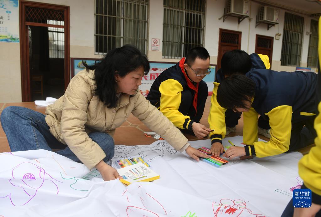 在廣西南寧高新區龍華學校,何冬艷教孤獨癥學生畫畫(3月31日攝)。