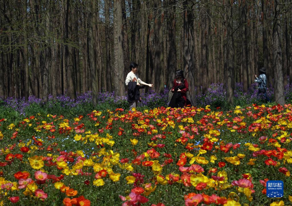 4月2日拍攝的上海共青森林公園的虞美人花海。