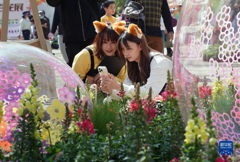4月2日,在上海共青森林公園,女孩們在花叢前拍照。
