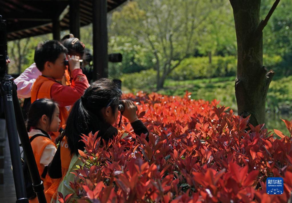 4月2日,在上海共青森林公園,小朋友們參加觀鳥活動。