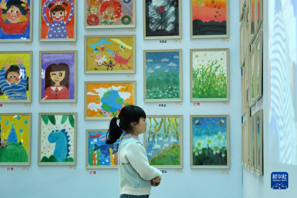 4月2日,小朋友在世界孤獨癥日主題慈善活動現場觀看藝術畫作。