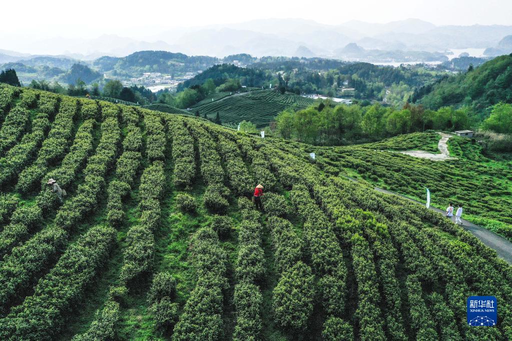 4月2日,村民在貴州省貴陽市神鵲茶場采摘春茶(無人機(jī)照片)。