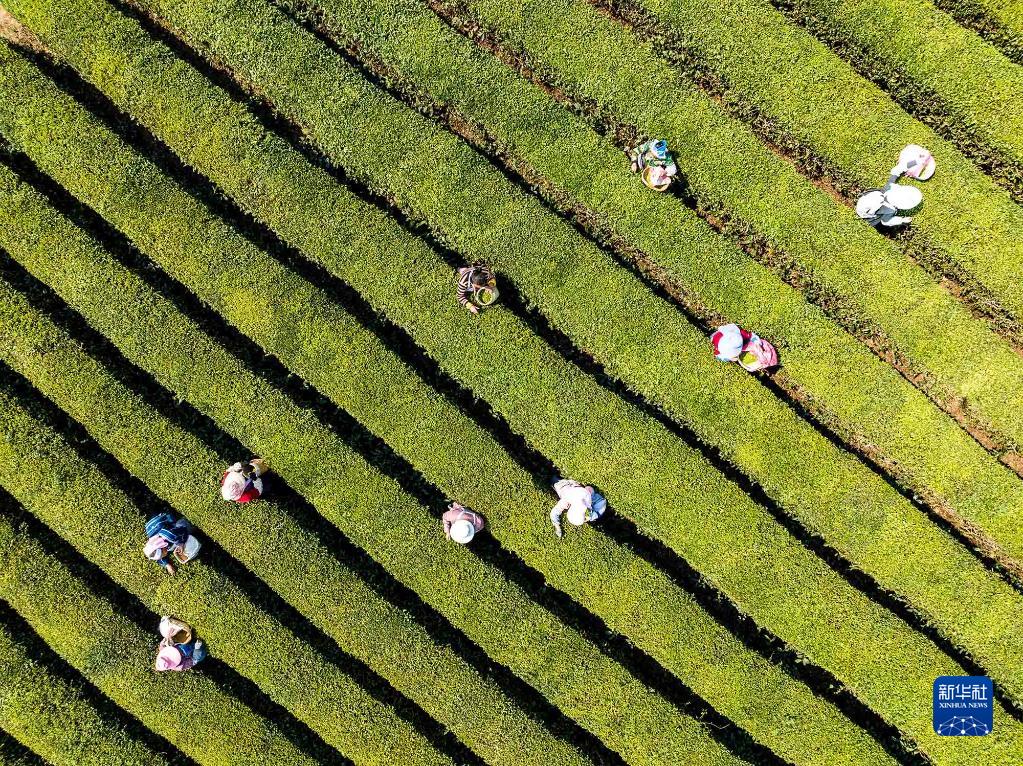 4月2日,茶農在貴州省安順市西秀區雙堡鎮一茶園采摘明前茶(無人機照片)。