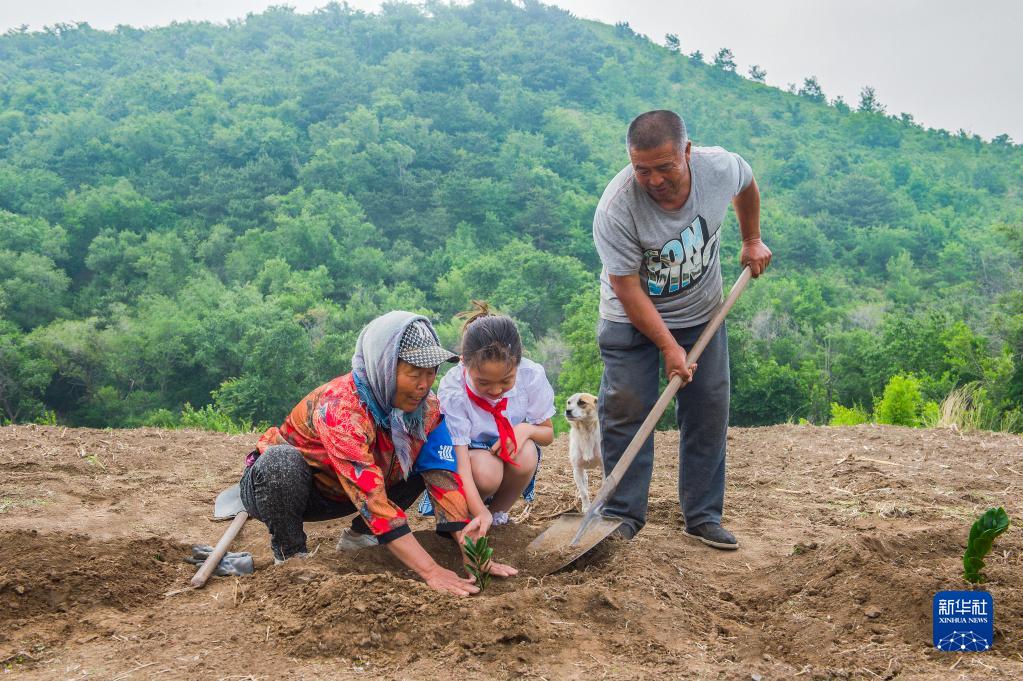田萬貴、陸敏夫婦和小朋友在遼寧省凌海市翠巖鎮前田屯村“鷺嶺”植樹(2022年6月3日攝)。