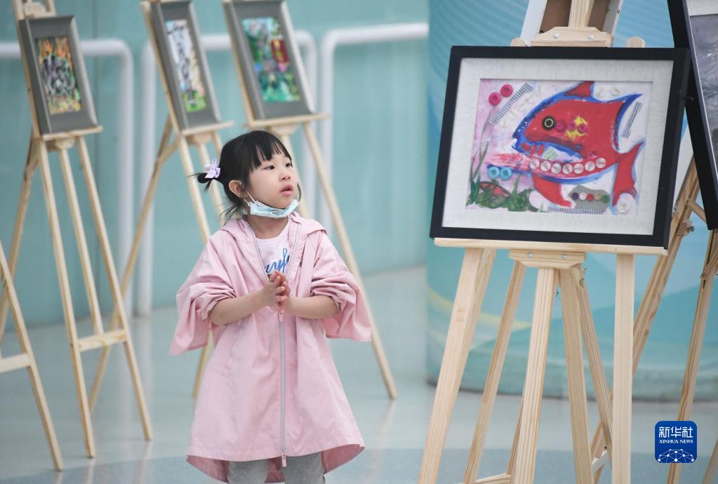 4月2日,一名小朋友在國(guó)家游泳中心“水立方”參觀融合兒童畫展。