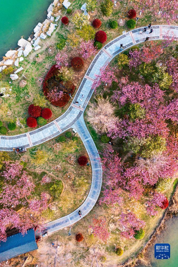 4月1日,人們在河南省商丘市日月湖景區櫻花島賞櫻游玩(無人機照片)。