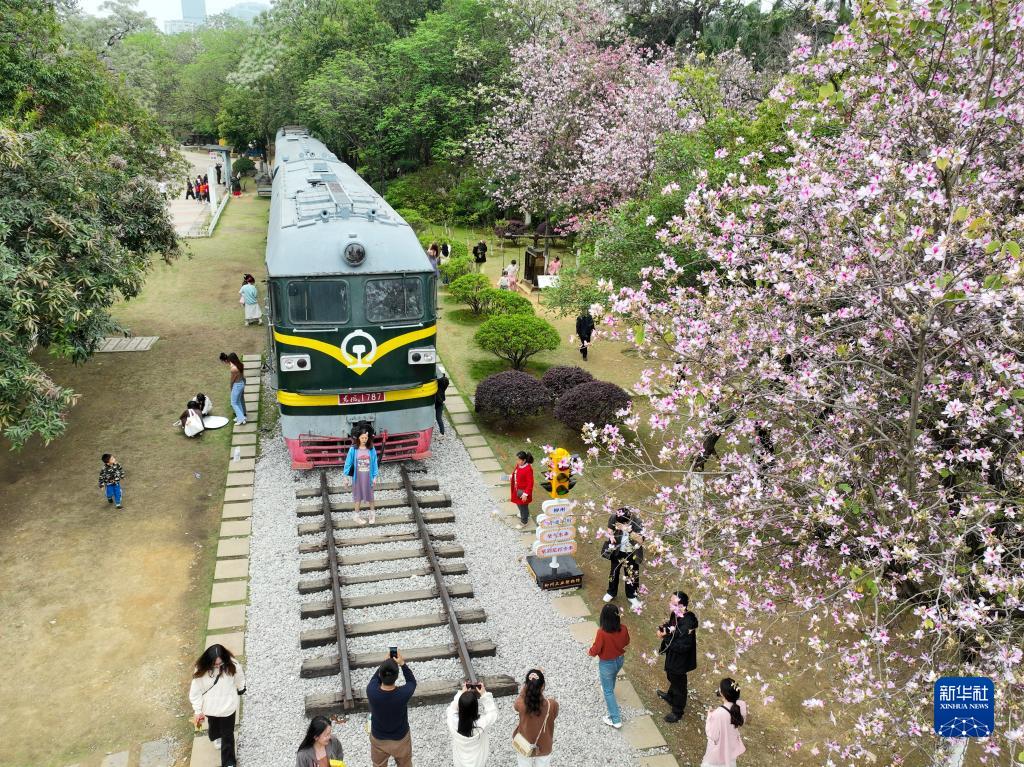 4月1日,在廣西柳州市工業博物館,市民在花下游玩(無人機照片)。