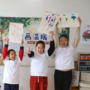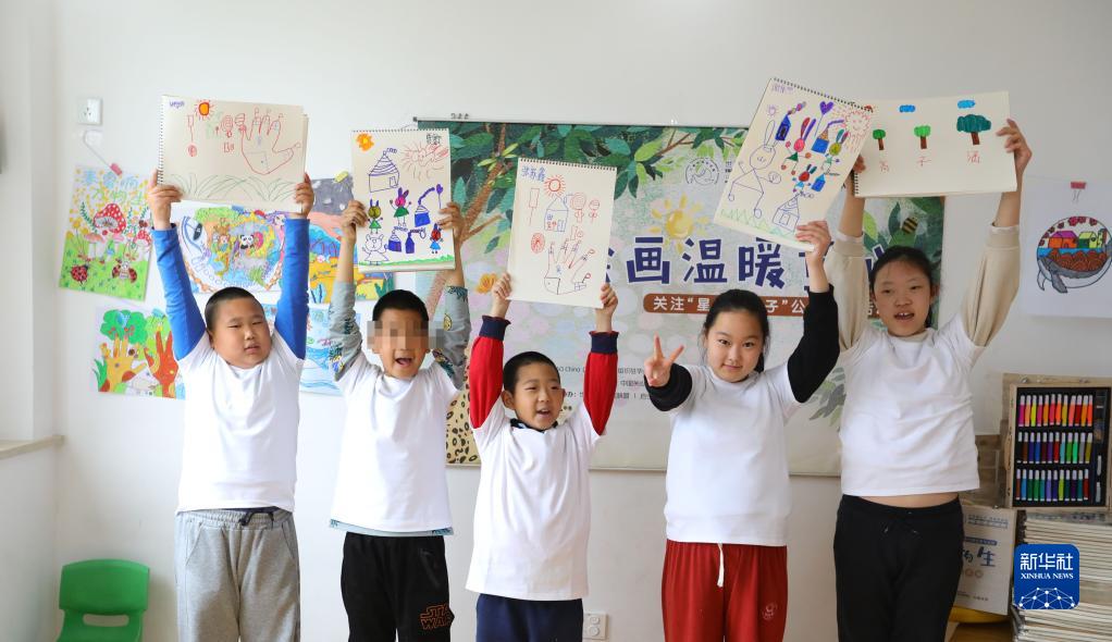 4月2日,在關注“星星的孩子”公益捐助活動上,幾名孤獨癥兒童展示畫作。