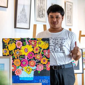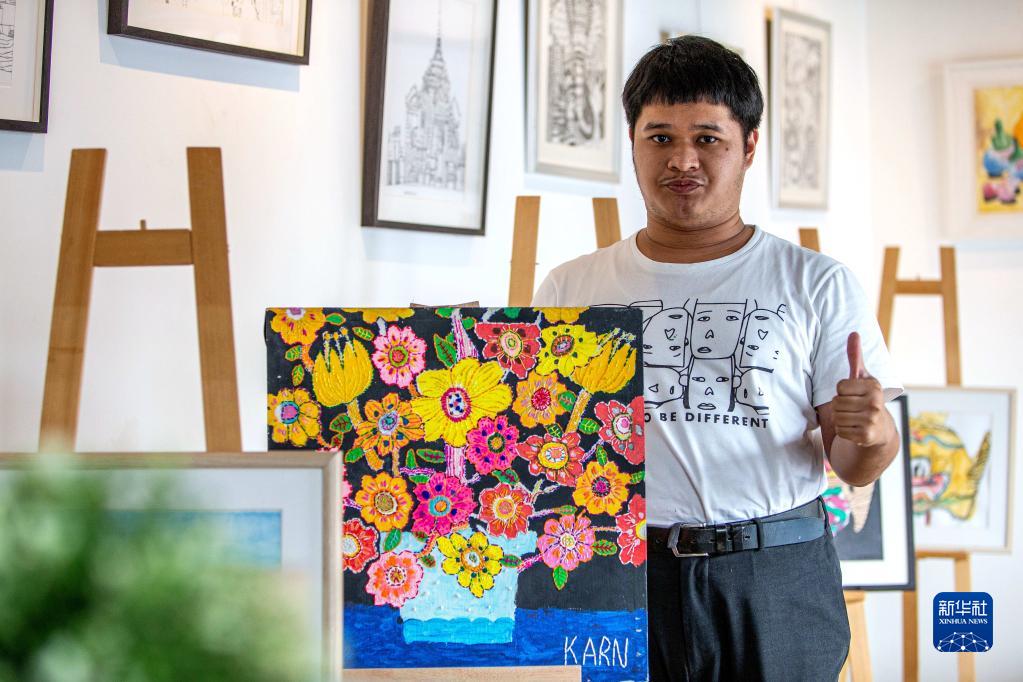 4月2日,在位于曼谷的泰國孤獨癥職業(yè)中心,一名孤獨癥患者展示自己的繪畫作品。