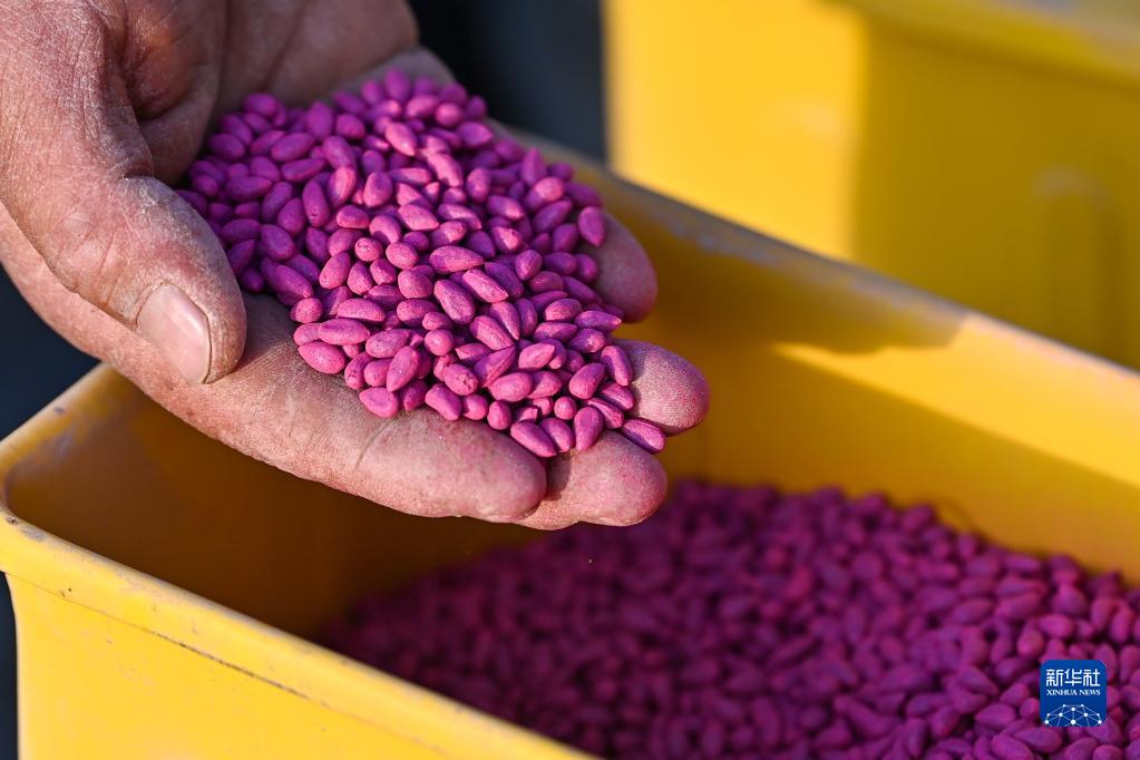 在新疆麥蓋提縣,棉農查看棉花種子(4月2日攝)。