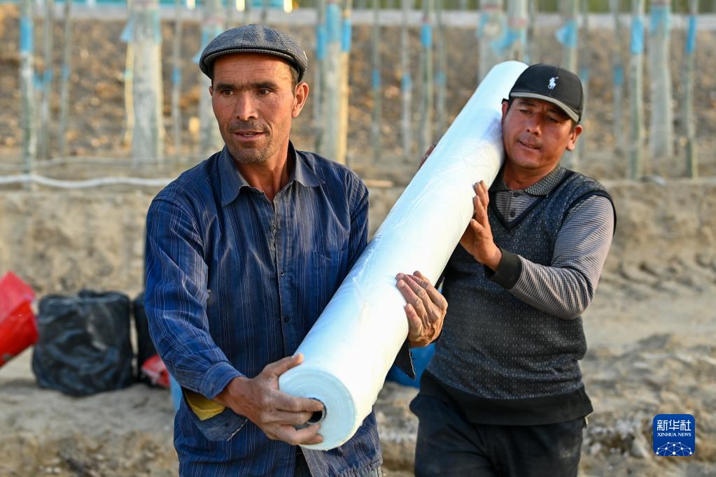 在新疆麥蓋提縣,棉農在搬運地膜(4月2日攝)。