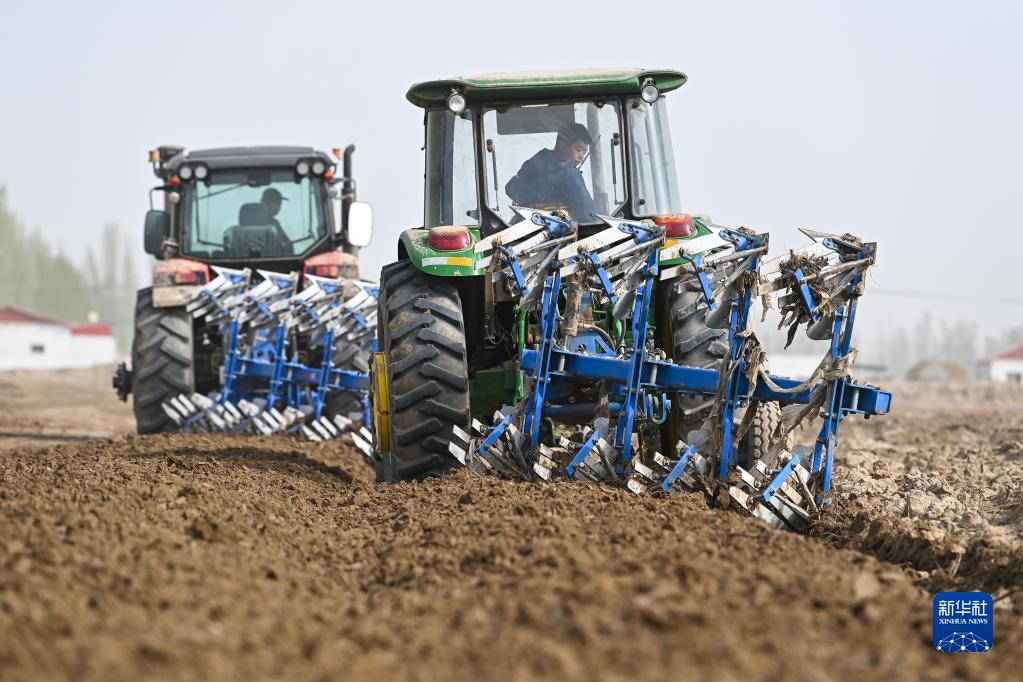 在新疆麥蓋提縣,棉農操作機械在棉田犁地(4月2日攝)。
