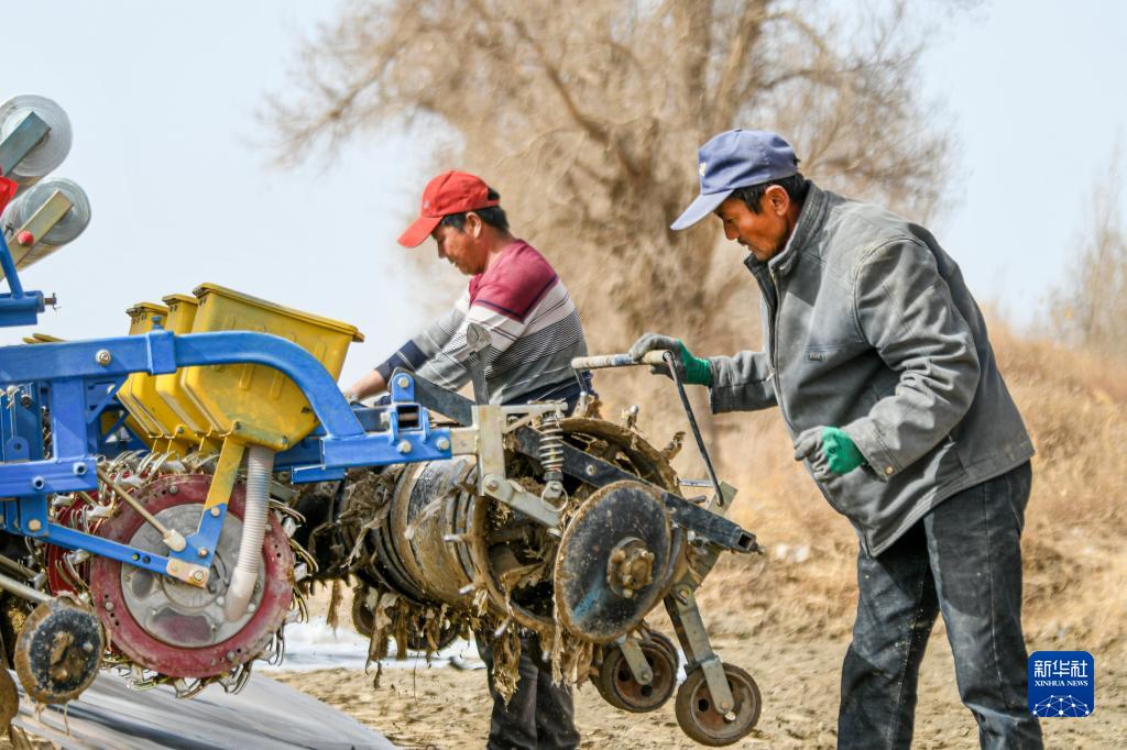 在新疆尉犁縣,棉農(nóng)在調(diào)試播種機(jī)(3月30日攝)。