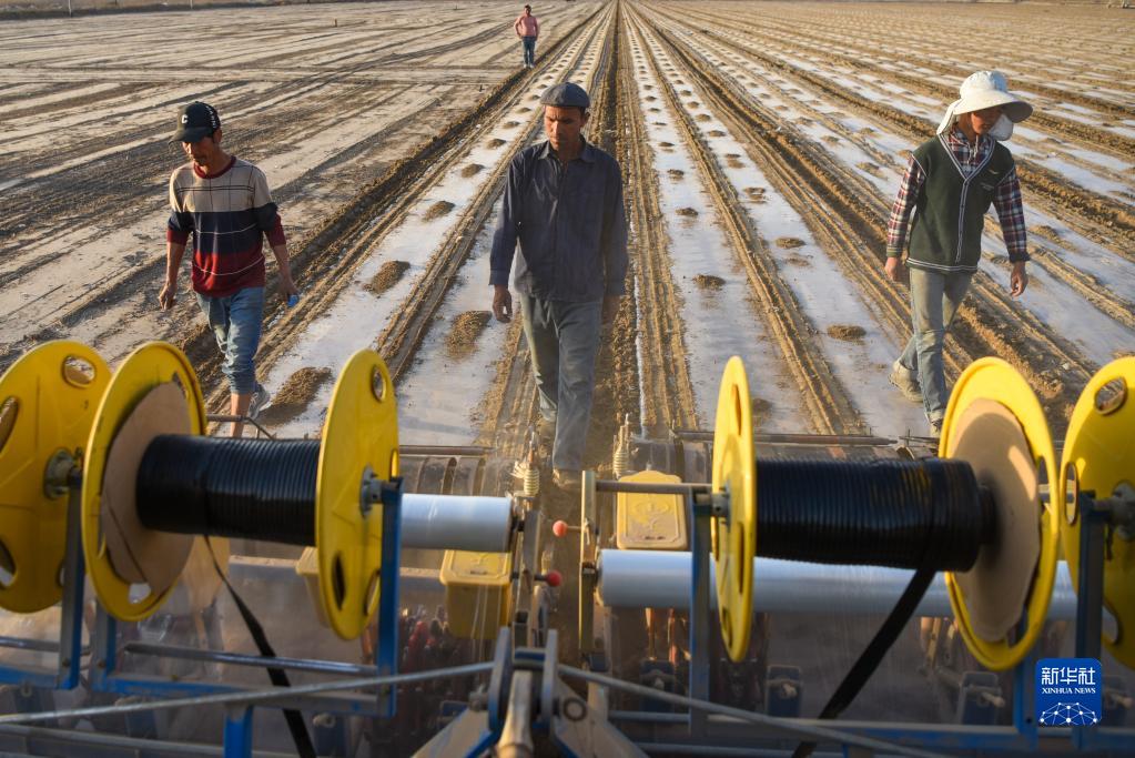 在新疆麥蓋提縣,搭載北斗導航系統的播種機在棉田春播,棉農緊跟其后查看開溝、地膜覆土等情況(4月2日攝)。