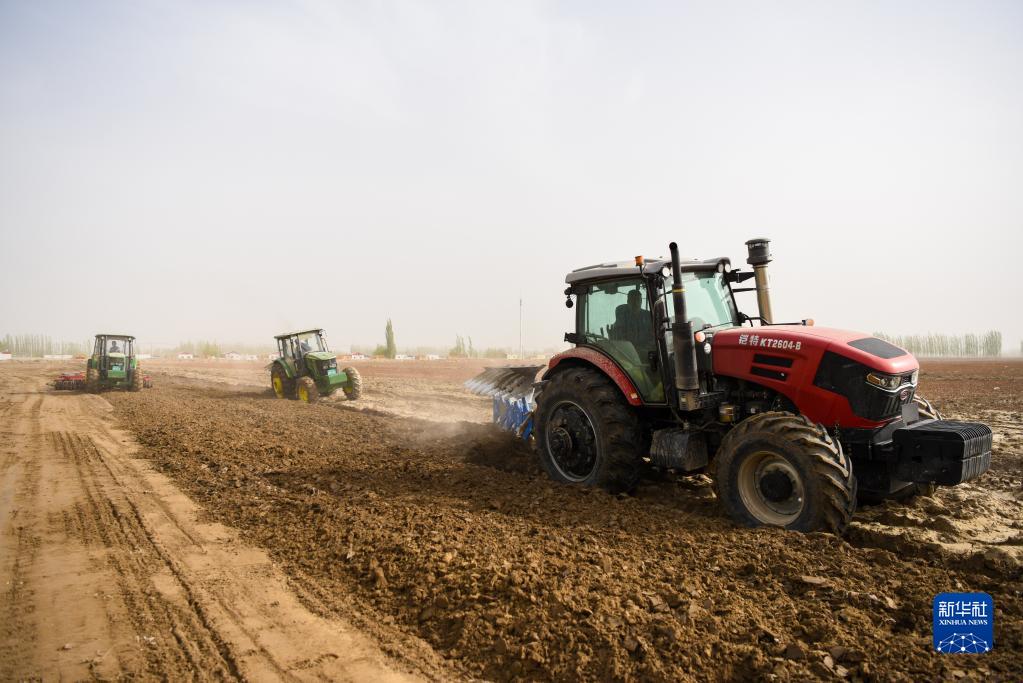 在新疆麥蓋提縣,棉農駕駛犁地機和整地機在棉田作業(4月2日攝)。